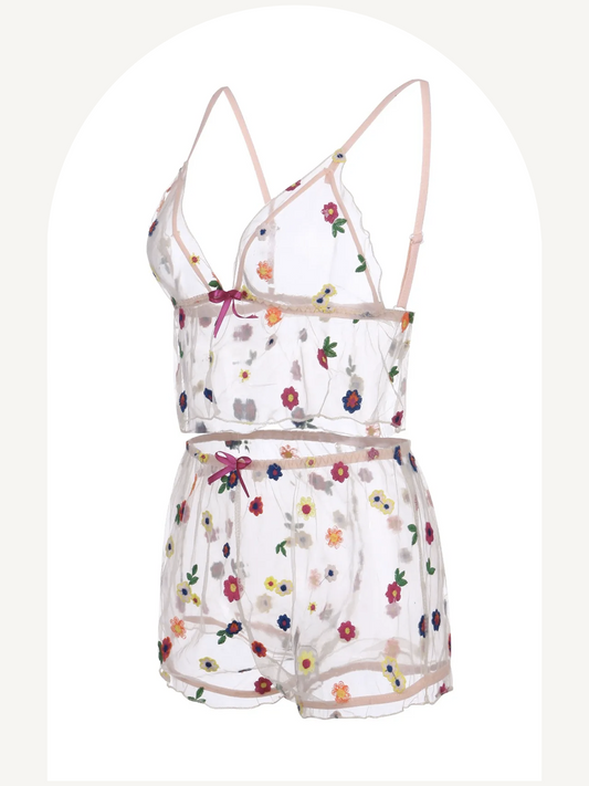 Pyjama aus Netzoberteil und Shorts mit Blumenstickerei
